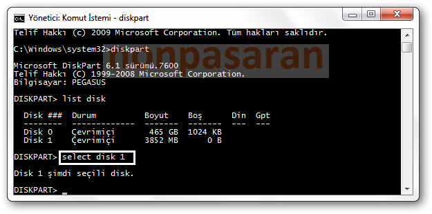 4- Ben örnek olarak USB belleğimi sileceğim ve üstteki resimde gördüğünüz üzere numarası (1)Bu yüzden select disk 1 komutunu yazıp Enter'a basıyorum.Sizde silmek istediğiniz diskin numarası kaçsa bu komutta 1 yerine o rakamı yazacaksınız.